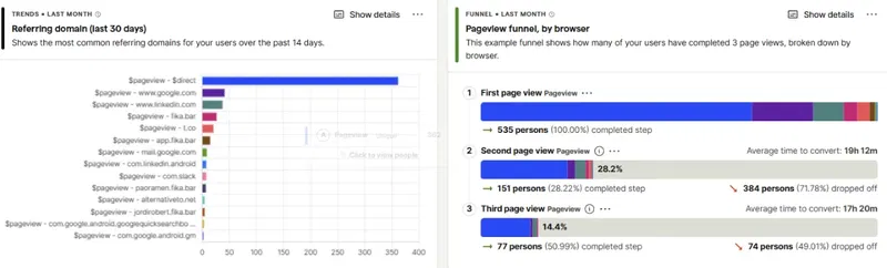 An analytics and Hotjar tool made by devs for devs. I had a lot of resistance at the beginning, because instead of using the well-known Google Analytics, which integrates super well with other platforms and is 100% connected to Search Console, I had to learn a new tool. It’s not that easy to use, but it’s super customizable and connected to all the data inside the product.